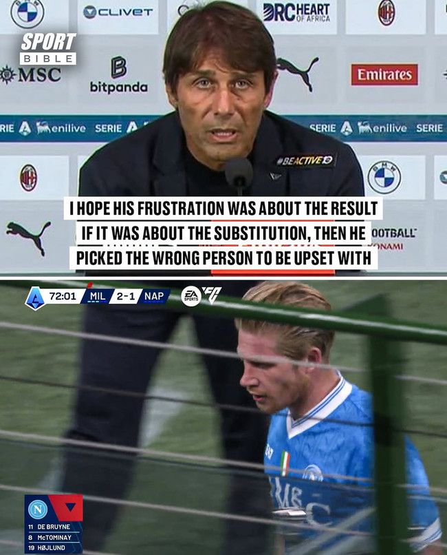 경기 후 콘테 감독은 "더 브라위너가 교체로 화가 났다면 그건 결과 때문이길 바란다. 그렇지 않다면 그는 잘못된 사람을 탓하는 것이다"라며 "할 말이 없다.난 교체가 옳았다고 생각한다"라고 이야기했다.
