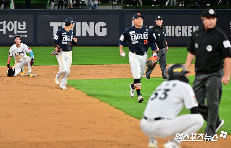 오원석은 노시환을 중견수 뜬공으로 처리하며 간신히 아웃카운트 하나를 올렸으나, 이진영에게 볼넷을 내주며 계속해 흔들렸다. 이도윤에게는 좌전안타를 맞으면서 다시 1, 2루 위기. 결국 KT 벤치는 오원석을 내리고 패트릭 머피를 투입했다.
