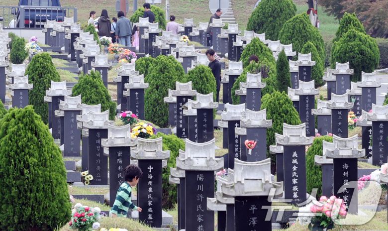 본격적인 추석 연휴가 시작된 3일 인천 부평구 인천가족공원을 찾은 성묘객들이 차례를 지내고 있다. 2025.10.3/뉴스1 ⓒ News1 이호윤 기자 |