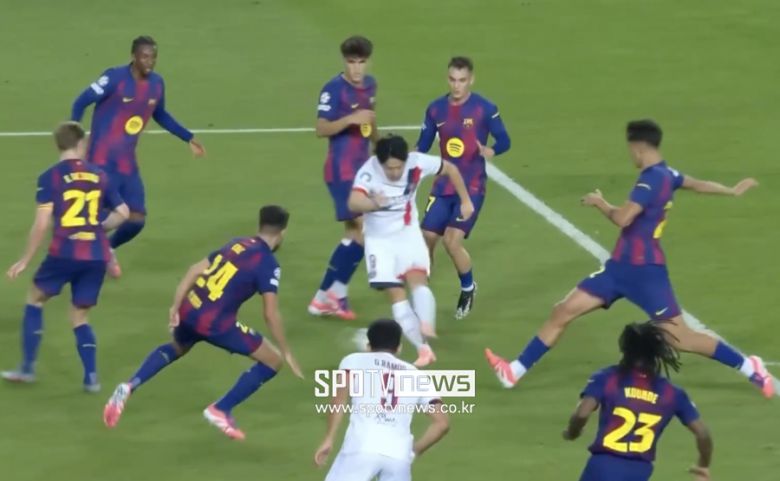역습 과정에서 바르셀로나 후방 라인이 흔들린 순간 이강인은 기라성 같은 카탈루냐 소속 6인에게 동시에 둘러싸였다.