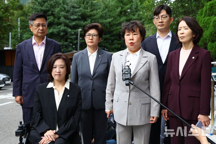 [서울=뉴시스] 황준선 기자 = 조배숙 의원을 비롯한 국민의힘 의원들이 4일 오후 공직선거법·국가공무원법 위반 등 혐의로 체포된 이진숙 전 방송통신위원장의 체포적부심이 열리는 서울 양천구 서울남부지방법원에서 이 전 위원장의 석방을 촉구하고 있다. 2025.10.04. hwang@newsis.com