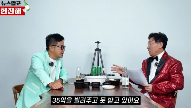그는 "시청자들에게 '뉴스 말고 한잔해'라는 이 프로가 희망이 되는 프로가 됐으면 좋겠다. 진실된 모습. 쇼윈도 연예인이 아니라 진실된 모습을 보여줬으면 좋겠다"며 "나도 어렵다. 일 없다 요즘에. 내가 빌려준 돈이 얼만지 아냐. 35억을 빌려주고 못 받고 있다. 내가 이런 미친놈이다"라고 한탄했다.