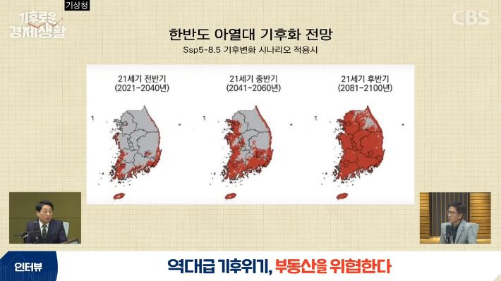 ◆ 홍종호> 그 얘기를 조금 자세하게 해 주시죠. 아열대 기후가 아무래도 남쪽에서부터 먼저 올라오지 않겠습니까? 날씨가 더워지고 아열대 기후가 된다고 했을 때 부동산, 특히 주택 쪽에 미칠 구체적인 영향은 어떤 게 있을까요?