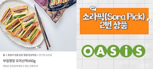 사실 전을 구매하는 것은 별로라는 생각을 했는데 오아시스에서 '무침명장 오미산적'을 구매하고 나서는 생각이 달라졌어. 개인적으로는 다른 전들은 직접 해먹은게 맛있었는데 '산적'은 여기 제품이 훨씬 나았어.
