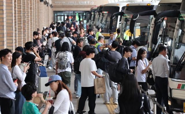 추석 연휴를 하루 앞둔 2일 오후 서울 서초구 고속버스터미널에서 귀성객들이 버스에 탑승하고 있다. 뉴스1 |