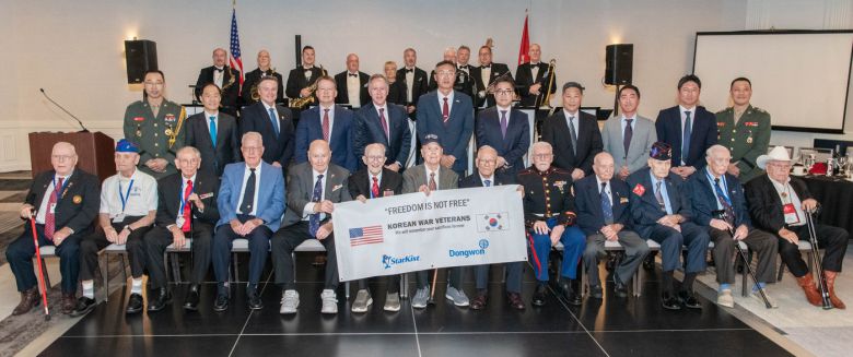 스타키스트가 4일(현지시간) 미국 버지니아주에서 한국전 참전용사들을 위한 만찬 행사를 개최한 가운데, 참전 용사들과 관계자들이 기념사진을 찍고 있다.(동원그룹 제공) |