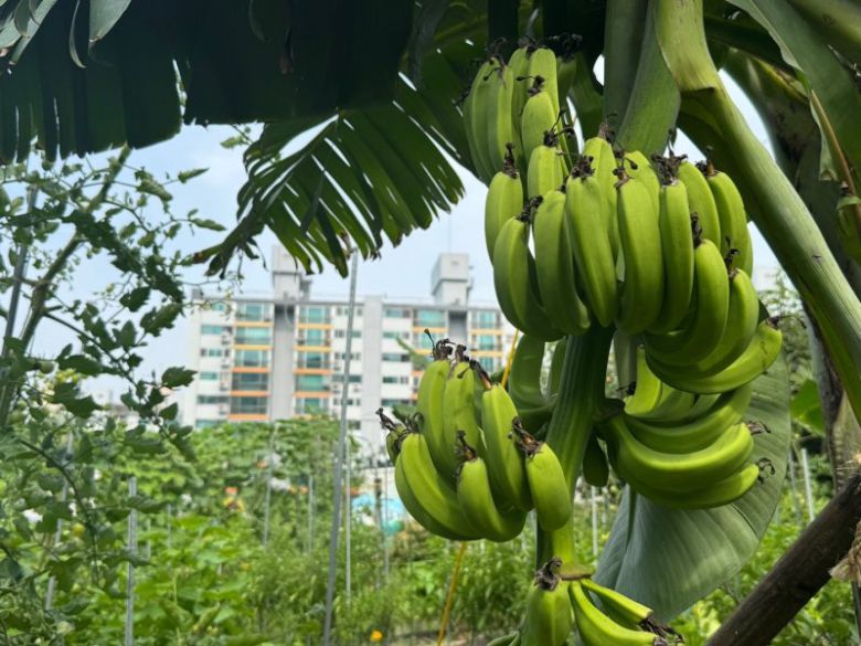 서울 노원구 천수주말농장 텃밭에 바나나가 주렁주렁 매달려 있다. 뉴스1 제공 |