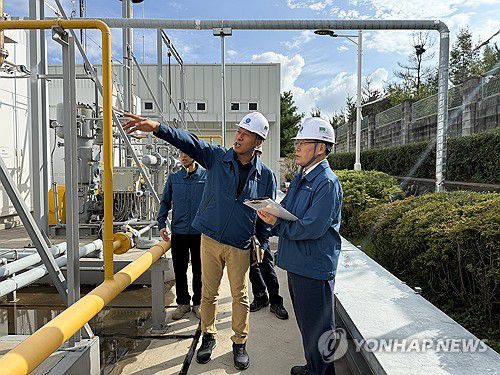 (대전=연합뉴스) 진수남(오른쪽) 한국가스기술공사 사장 직무대행이 5일 전북 완주 수소전주기 클러스터 생산·충전 시설을 찾아 중대재해 예방을 위한 현장 안전 점검을 하고 있다. 2025.10.5 [한국가스기술공사 제공. 재판매 및 DB 금지]
