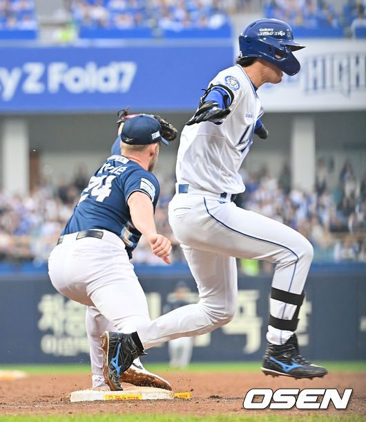 [OSEN=대구, 이석우 기자] 6일 대구 삼성라이온즈파크에서 2025 신한 SOL뱅크 KBO 와일드카드 결정전 삼성 라이온즈와 NC 다이노스의 경기가 열렸다. 홈팀 삼성은 후라도가 방문팀 NC는 구창모가 선발 투수로 출전했다. 삼성 라이온즈 구자욱이 9회초 유격수 땅볼 실책으로 1루에서 세이프되고 있다. 2025.10.06 / foto0307@osen.co.kr 이 기사의 카테고리는 언론사의 분류를 따릅니다.0공유하기