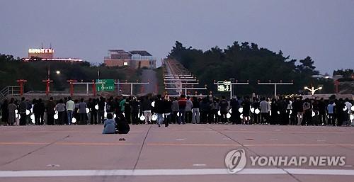 (무안=연합뉴스) 정다움 기자 = 추석인 6일 오후 전남 무안군 무안국제공항 활주로에서 열린 12·29 제주항공 여객기 참사 유가족 협의회의 추모행사에서 유가족들이 로컬라이저 앞에 앉아있다. 2025.10.6