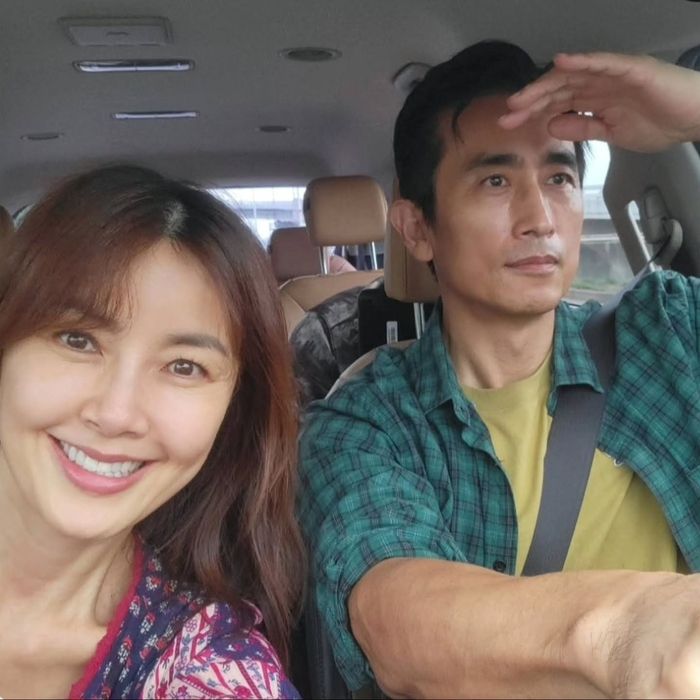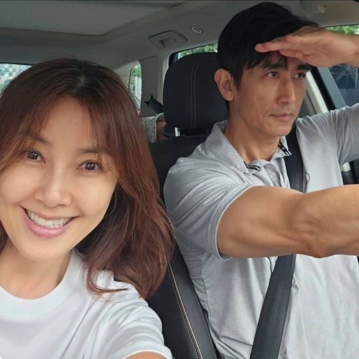 공개된 사진 속에는 차 안에서 똑같은 포즈를 취하고 있는 신애라-차인표 부부의 모습이 담겨 있다.