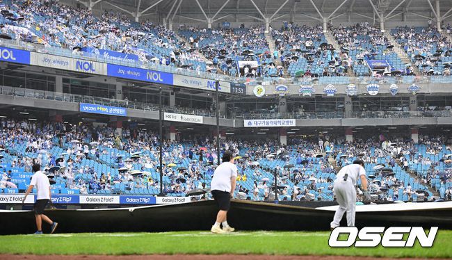 [OSEN=대구, 이석우 기자] 7일 대구 삼성라이온즈파크에서 2025 신한 SOL뱅크 KBO 와일드카드 결정전 삼성 라이온즈와 NC 다이노스의 경기가 열린다. 홈팀 삼성은 원태인이 방문팀 NC는 로건이 선발 투수로 출전한다. 갑자기 비가 내리자 관계자들이 방수포를 덮고 있다. 2025.10.07 / foto0307@osen.co.kr 이 기사의 카테고리는 언론사의 분류를 따릅니다.0공유하기