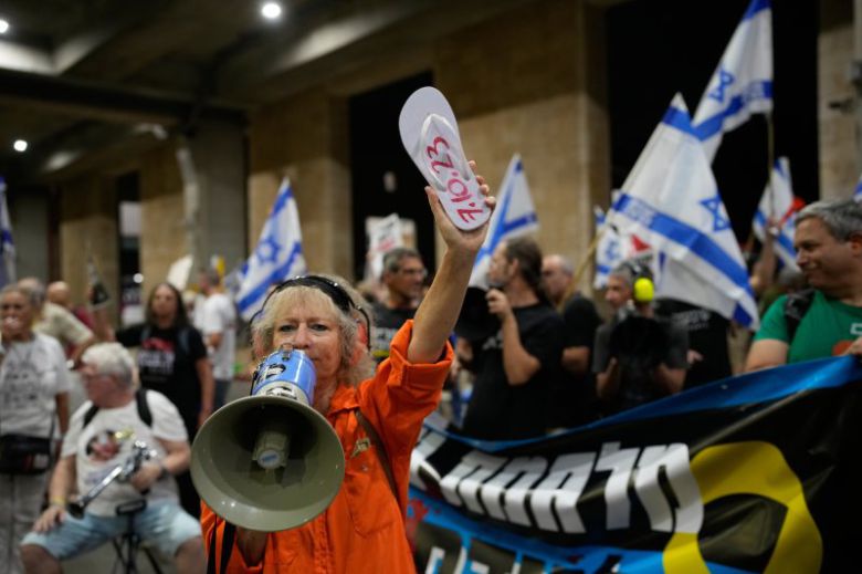 지난달 24일 이스라엘 텔아비브 인근 벤구리온 공항에서 시위대가 가자지구 전쟁 종식과 하마스에 억류된 인질들의 즉각 석방을 요구하며 베냐민 네타냐후 총리 정부에 반대하는 시위를 벌이고 있다. 사진=AP/뉴시스 |