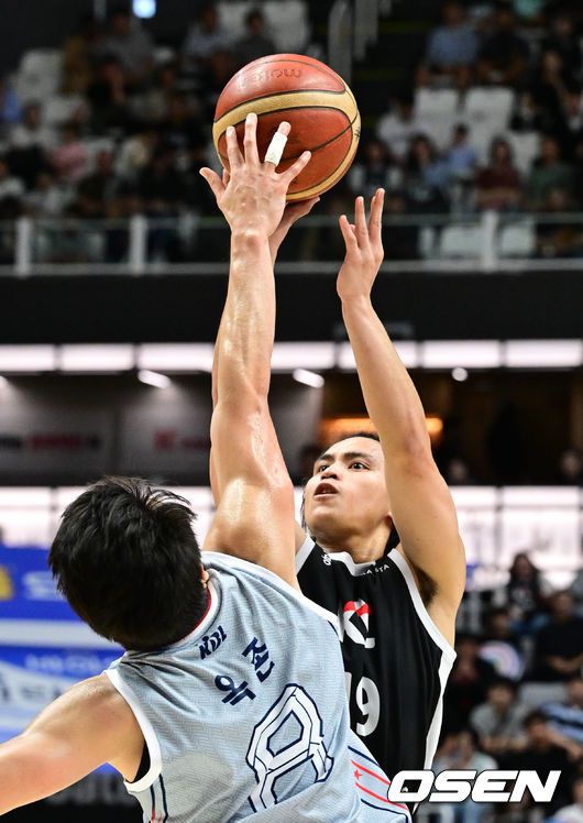 [OSEN=수원, 조은정 기자]7일 오후 서수원칠보체육관에서 2025-2026 LG전자 프로농구 수원 KT 소닉붐과 울산 현대모비스 피버스의 경기가 열렸다. 수원 KT와 울산 현대모비스는 나란히 1승 1패를 기록 중이다. 4쿼터 KT 카굴랑안이 현대모비스 옥존에 블록 당하고 있다. 2025.10.07 /cej@osen.co.kr 이 기사의 카테고리는 언론사의 분류를 따릅니다.0공유하기