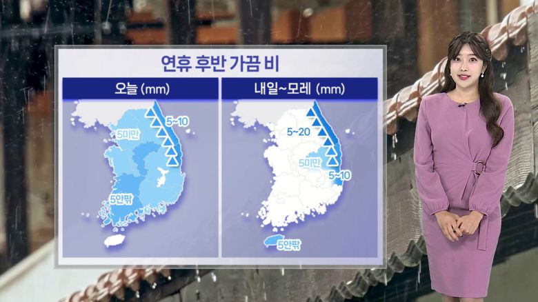 내일은 전국적으로 약한 빗방울이 스치는 가운데, 오후부터는 동해안을 중심으로 5~20mm 더 내리겠습니다.