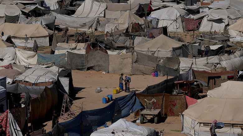 ▲ 가자지구에 설치된 임시텐트 캠프에 이스라엘 작전 중 피난민들이 서 있다.