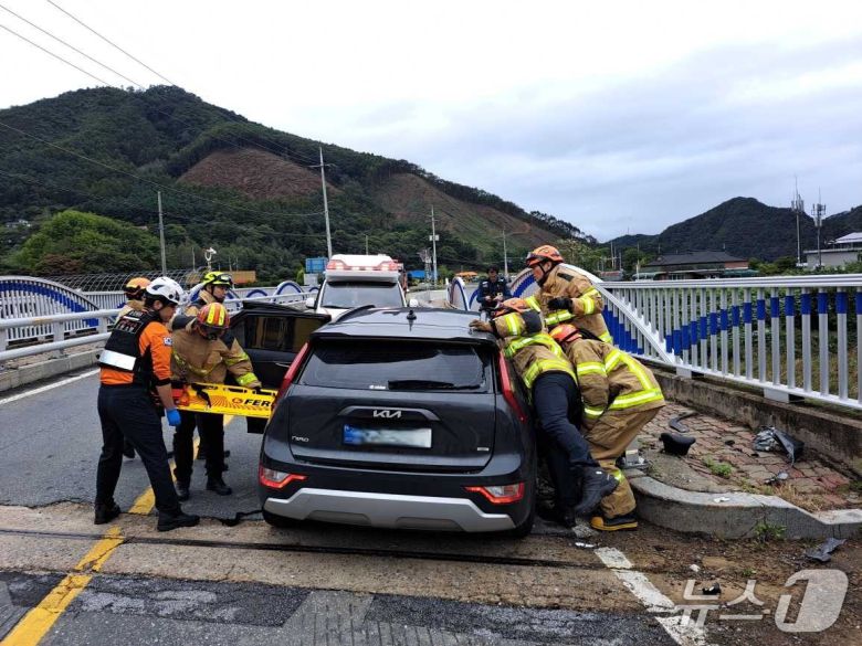 (홍천=뉴스1) 한귀섭 기자 = 지난 7일 오후 3시 47분쯤 강원 홍천 화촌면 군업리 군업천 다리에서 A 씨(52)가 몰던 니로 차량이 가드레일을 들이받았다.