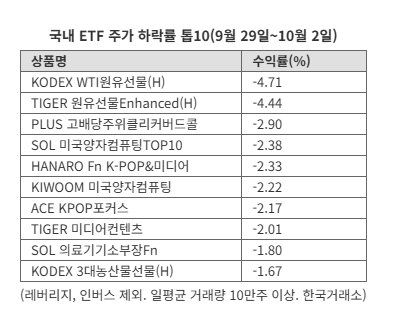 반면 원유 관련 ETF는 미국의 증산 기조 강화와 국제 유가 약세에 동반 하락했다. ‘KODEX WTI원유선물(H)’(-4.71%)과 ‘TIGER 원유선물Enhanced(H)’(-4.44%)가 하락률 상위를 차지했다.