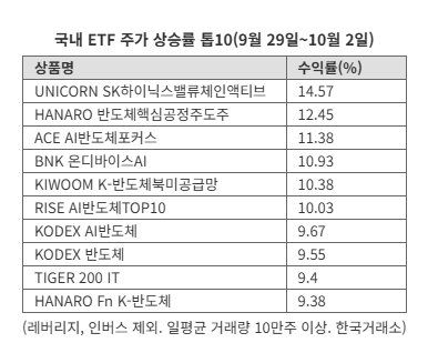 8일 한국거래소에 따르면 지난달 29일부터 이달 2일까지 수익률 상위 ETF는 ‘UNICORN SK하이닉스밸류체인액티브’로 한 주간 14.57% 급등했다. 이어 ‘HANARO 반도체핵심공정주도주’(12.45%), ‘ACE AI반도체포커스’(11.38%), ‘BNK 온디바이스AI’(10.93%), ‘KIWOOM K-반도체북미공급망’(10.38%) 등이 뒤를 이으며 주요 AI 반도체 ETF가 상위권을 휩쓸었다. 레버리지 및 인버스 ETF와 일평균 거래량 10만주 미만 종목은 제외한 기준이다.