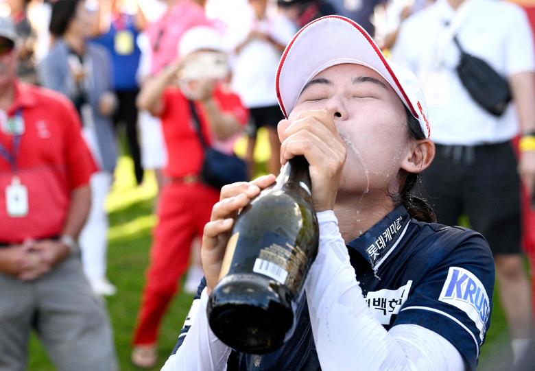 우승 뒤 이탈리아 스파클링 와인 프로세코 빌라 산디를 마시는 황유민. AFP연합뉴스