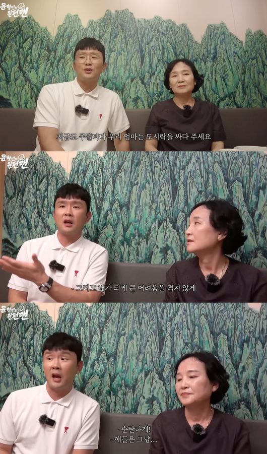 윤형빈의 모친은 "맞다. 보면 힘든 일 없고, 순탄했다. 그런데 나이를 먹으면서 잔소리를 많이 하게 되더라"라며 멋쩍어 했다. 그럼에도 윤형빈은 모친의 애정 어린 잔소리를 웃으며 반겼다.