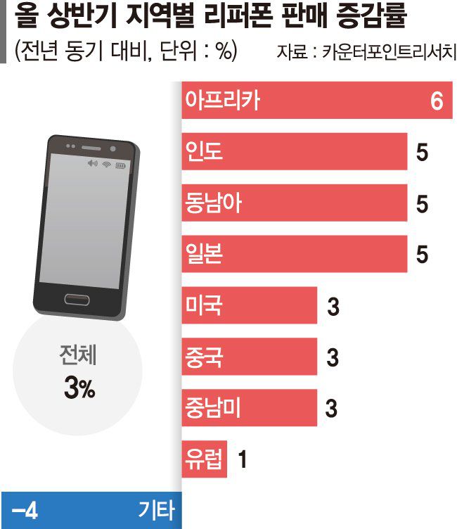 전체적으로 미국과 주요 유럽 국가들은 리퍼폰 시장이 미미한 성장세를 보이거나 오히려 판매량이 줄어드는 추세를 보였다. 선진국 중 일본만 유일하게 작년 같은 기간 대비 5% 성장했을 뿐 선진국 리퍼폰 시장은 전체 성장률이 1% 수준에 머물렀다.