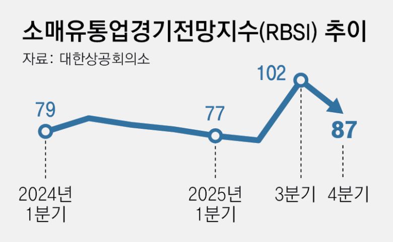 발표에 따르면 올 4분기 RBSI는 87로 3분기(7∼9월) 102에서 15포인트 하락했다. 올 3분기 RBSI가 2021년 3분기 이후 처음으로 기준치를 넘기며 회복의 기미를 보였지만 한 분기 만에 다시 기준치 이하로 떨어진 것이다. 대한상의는 “경기 둔화와 내수 부진 지속, 업태 간 경쟁 심화 등 복합적 요인으로 인해 4분기 전망치가 상승 흐름을 이어가지 못했다”고 설명했다.