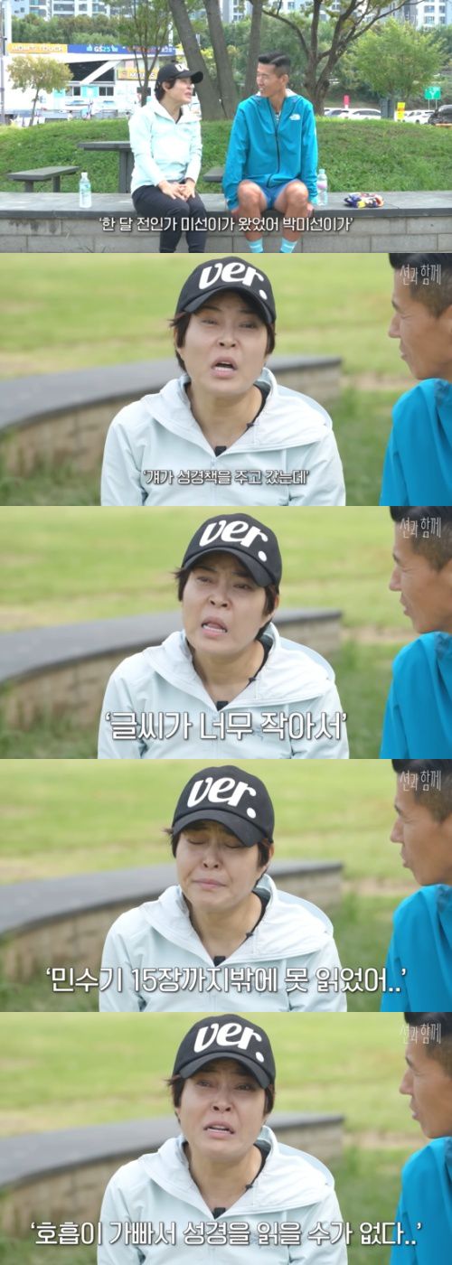 전유성이 많이 위독하다는 얘기를 들은 조혜련은 "다음날 남편과 전유성 오빠를 만나러 병원으로 갔다. 너무 마른 몸에 폐가 안 좋으니까 계속 100m 달리기를 하는 것 같은 호흡을 하더라"며 "'오빠 나 혜련이야. 어때요?'라고 했는데 정신은 말짱하셨다. '알아. 왔냐?' '좋아 보이냐? 힘들다'라고 하셨다. 그리고 '한 달 전인가 미선이가 왔었어. 걔가 성경책을 주고 갔는데 글씨가 너무 작아서 내가 민수기 15장까지 못 읽었어. 눈이 안 보여서 호흡이 가빠서 성경을 읽을 수가 없다'고 했다"며 당시를 떠올리면서 눈물을 멈추지 못했다.