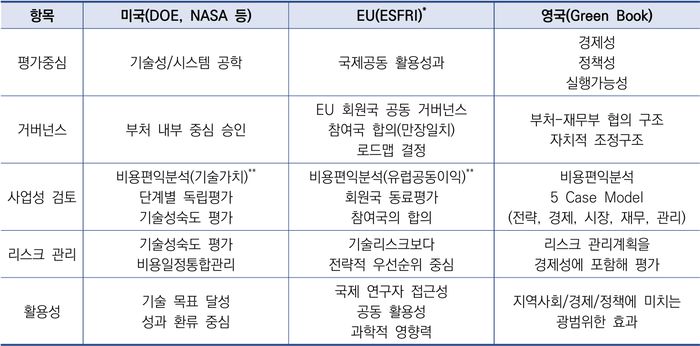 보고서는 주요국과 달리 한국은 예비타당성조사(예타)를 통해 사업 추진 타당성을 검토하고 있으나, 사업 유형에 관계없이 동일한 평가기준과 절차를 적용한다고 분석했다.