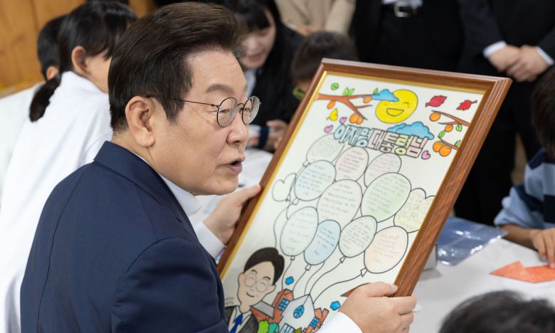 이재명 대통령이 3일 인천 강화군 아동양육시설 계명원을 방문해 아이들이 쓴 메시지가 담긴 액자를 보고 있다. 대통령실제공 |