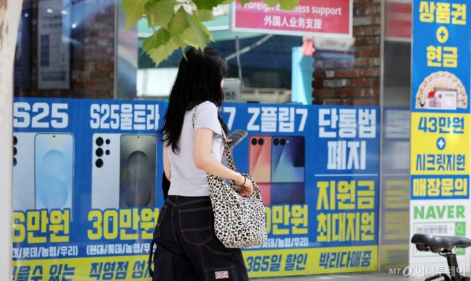 [서울=뉴시스] 조성우 기자 = 단통법(이동통신단말장치 유통구조 개선에 관한 법률) 폐지 첫날인 22일 서울 시내의 한 휴대폰 대리점에 단통법 폐지 관련 홍보물이 붙어 있다. 단통법이 폐지되면서 이동통신사의 단말기 지원금 공시 의무가 폐지되고, 공시지원금의 15% 이내로 제한했던 유통점의 추가지원금 상한도 사라진다. 2025.07.22. /사진=조성우 |