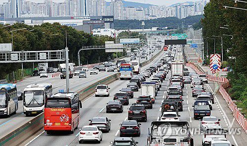 (오산=연합뉴스) 홍기원 기자 = 추석 연휴 마지막 날인 9일 경기도 오산시 경부고속도로 오산IC 부근 서울 방향(오른쪽)이 정체되고 있다. 2025.10.9