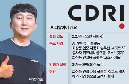 곽 대표는 "11월부터 화장품 업계 인력 채용 플랫폼(잡코스)도 시작해 사업 영역을 확대할 것"이라며 "올해 매출 100억원을 기대한다"고 밝혔다. 씨디알아이는 기술력을 인정받아 국가신기술(NET) 인증을 위한 2차 심사에 통과했다.