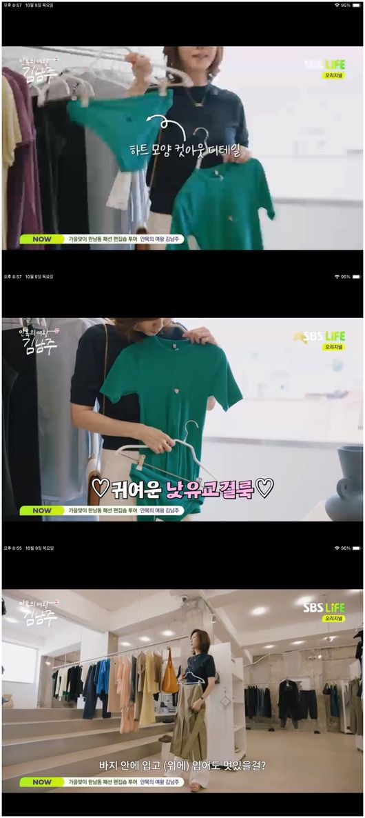 9일 방영한 SBS Life ‘안목의 여왕 김남주’에서는 스타일의 일가견이 있는 김남주의 가을 패션 쇼핑이 시작되었다. 김남주는 5부 반팔 니트 상의에 허리가 좁아 보이고 통이 넉넉한 7부 팬츠를 입어 우아하면서도 편안한 느낌을 뽐냈다.