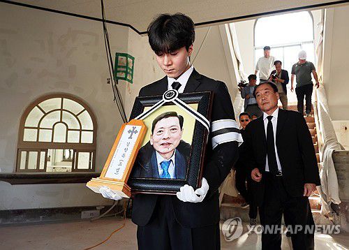 (광주=연합뉴스) 조남수 기자 = 5·18 시민소년군 故 김향득 유가족들이 10일 오전 광주 동구 금남로 옛 전남도청에서 노제를 지내고 있다. 2025.10.10
