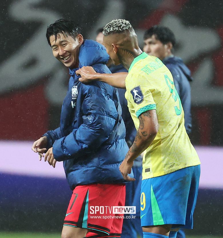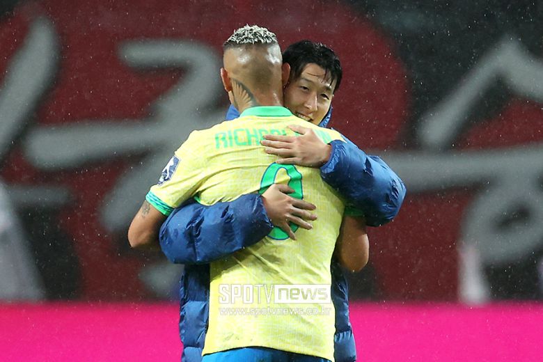 경기 종료 후 손흥민은 인사를 하기 위해 다시 그라운드로 나왔고 이때 토트넘에서 함께 뛰었던 브라질 히샬리송과 반가운 인사를 했다.