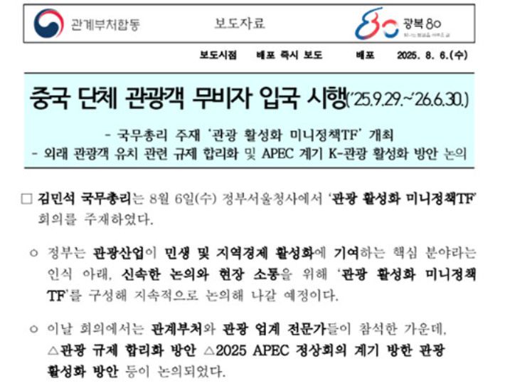 김민석 국무총리 주제로 '관광 활성화 미니정책TF' 회의를 열고 다음 달 29일부터 내년 6월30일까지 중국인 단체 관광객을 대상으로 무비자 입국을 허용하는 방안을 확정했다고 밝혔다. 중국은 지난해 11월부터 한국인의 무비자 입국을 허용했다. 이에 한국 정부도 중국인 단체 관광객을 대상으로 무비자 정책을 시행하기로 하고 관계 부처 간 협의를 진행 중이었다. 이날 국정기획위원회 규제 합리화 TF에서 이를 신속 추진 과제로 지정해 정부에 제안하기도 했다. 사진=법무부 제공