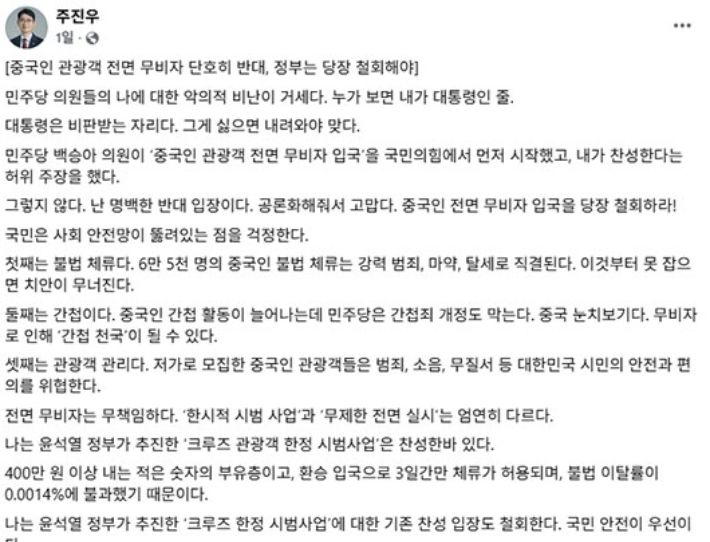 주진우 국민의힘 의원은 백승아 더불어민주당 원내대변인의 '중국인 관광객 전면 무비자 입국을 국민의힘에서 먼저 시작했다'는 지적에 대해 "내가 찬성한다는 허위 주장을 했다"고 반박했다. 이어 " 중국인 전면 무비자 입국을 당장 철회하라"고 입장을 밝히면서 "나는 윤석열 정부가 추진한 '크루즈 관광객 한정 시범사업'은 찬성한 바 있다. 400만 원 이상 내는 적은 숫자의 부유층이고 환승 입국으로 3일간만 체류가 허용되며, 불법 이탈률이 0.0014%에 불과했기 때문이다. 나는 윤석열 정부가 추진한 '크루즈 한정 시범사업'에 대한 기존 찬성 입장도 철회한다. 국민의 안전이 우선이다. 이재명 정부는 중국인 관광객 전면 무비자 정책을 철회하고 원점에서 재검토하라"고 압박했다. 사진=주진우 SNS 캡처