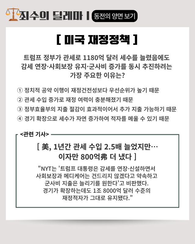 ■ 美 재정건전성 악화: 도널드 트럼프 미국 대통령이 보편관세 정책을 통해 관세 수입을 1950억 달러로 2.5배 늘렸지만 공공부채 순이자가 1조 290억 달러로 급증하며 세입의 20%를 이자 상환에 사용하는 구조적 취약성이 드러났다. 메디케어와 사회보장 프로그램이 각각 8%씩 늘어나며 일론 머스크 테슬라 최고경영자(CEO)가 이끈 정부효율부의 지출 절감 노력에도 재정적자 1조 8000억 달러 수준이 고착화되고 있다.
