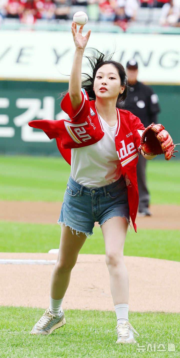 [서울=뉴시스] 박주성 기자 = 11일 인천 미추홀구 SSG랜더스필드에서 열린 2025 KBO 포스트시즌 준플레이오프 2차전 삼성 라이온즈와 SSG 랜더스의 경기, 배우 최희진이 시구를 하고 있다. 2025.10.11. park7691@newsis.com