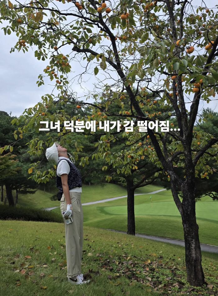또 감나무 밑에 서서 떨어지는 감을 받아먹으려는 김지혜의 포즈에는 "아내 덕분에 내가 감 떨어짐"이라며 너스레를 떨기도 했다.