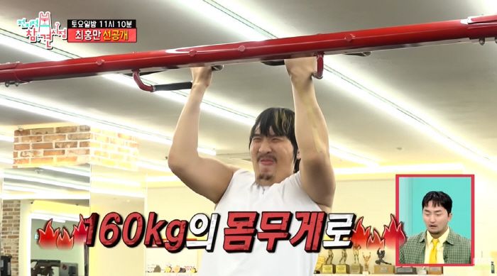 이후 풀업바부터 시작, 이 과정에서 160kg 몸무게의 중력을 거스르며 폭풍 풀업을 하는 모습은 놀라움을 자아낸다. 여기에 매니저들의 도움을 받아 무려 130kg의 무게를 거침없이 들어 올리는 최홍만의 모습은 보는 이들의 입을 쩍 벌어지게 만들었다. 이후 고강도 유산소 운동으로 마무리 하던 최홍만은 천장에 닿은 머리로 웃음을 자아냈다.