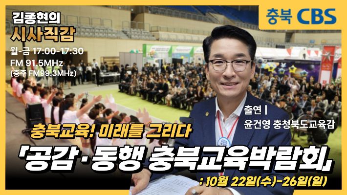 ◇ 김종현> <시사직감>, 오늘은 <충북교육, 미래를 그리다> 코너로 진행됩니다. 교육은 흔히 백년대계로 일컬어지죠. <충북교육, 미래를 그리다>는 교육의 중요성을 다시 한 번 환기하면서 충북 교육의 현 주소를 들여다보고 미래를 전망해 보는 시간입니다. 진행 방식은요, 저희 취재진이 이슈가 되는 교육 현장을 직접 찾아가서 취재한 내용도 전해드리고 정책 담당자가 스튜디오에 직접 출연해 상세한 설명과 함께 비전을 제시해 드립니다. <충북교육, 미래를 그리다>, 연말까지 모두 10차례 이어갈 텐데요. 다섯 번째 시간인 오늘은 오는 22일부터 닷새 동안 열릴 <2025 공감·동행 충북교육박람회>에 대해서 이야기 나눠봅니다. 청취자 여러분께 박람회 소식 전해드리기 위해서 오늘은 특별히 윤건영 충북교육감 직접 나와주셨습니다. 윤 교육감께 공감·동행 충북교육박람회 모든 것 들어보고요. 그리고 이한솔 아나운서도 함께 이야기 나누겠습니다. 오늘 방송은 유튜브 충북CBS를 통해서도 실시간 시청하실 수 있습니다. 스튜디오에 두 분 나오셨습니다. 안녕하십니까?