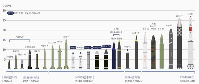 북한이 보유한 미사일은 사거리에 따라 근거리, 단거리, 준중거리, 중거리, 대륙간탄도미사일(ICBM) 등으로 구분할 수 있다. 근거리 탄도미사일(CRBM)은 사거리 300㎞ 이하, 단거리 탄도미사일(SRBM)은 사거리 300~1000㎞ 이하, 준중거리 탄도미사일(MRBM)은 사거리 1000~3000㎞, 중거리 탄도미사일(IRBM)은 사거리 3000~5500㎞, 대륙간 탄도미사일(ICBM)은 사거리 5500㎞ 이상이다.
