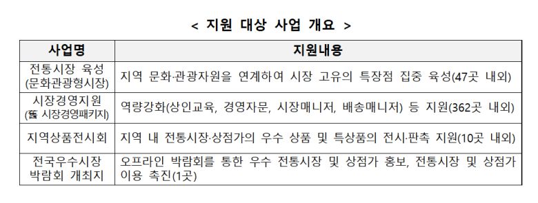 12일 중기부에 따르면 이번 공고는 '전통시장 및 상점가 육성을 위한 특별법' 제2조에 따른 전통시장, 상점가, 골목형상점가 등을 대상으로 문화관광형시장, 시장경영지원(옛 시장경영패키지), 지역상품전시회, 전국우수시장박람회 개최지 등 총 4개 사업에 대해 모집한다.