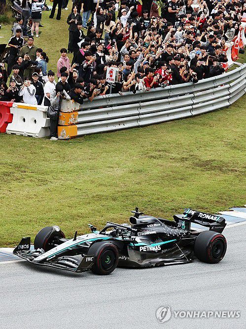 (용인=연합뉴스) 홍기원 기자 = 12일 경기 용인시 에버랜드 스피드웨이에서 열린 '피치스 런 유니버스 2025'에서 발테리 보타스가 운전하는 메르세데스-AMG 페트로나스 F1팀 차량이 서킷을 질주하고 있다. 2025.10.12