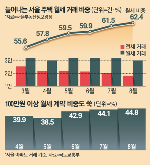 월세시장으로 눈을 돌리는 주거 수요자 비중도 늘어났다. 서울부동산정보광장에 따르면 지난 8월 서울 주택 전월세 거래 4만8031건 중 월세 거래는 62.4%(2만9955건)를 차지했다. 월세 비중은 지난 3월(55.6%) 이후 꾸준히 높아지는 추세다.