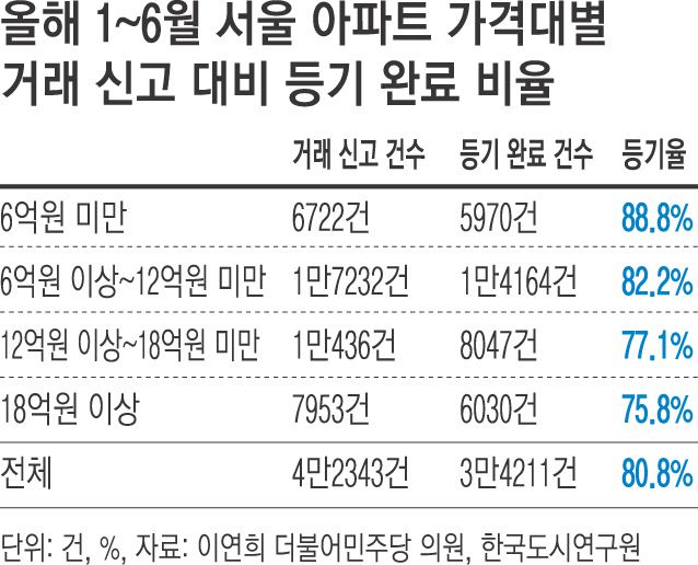 국회 국토교통위원회 소속 이연희 더불어민주당 의원과 한국도시연구소가 12일 국토교통부 실거래가 자료를 분석한 결과, 올해 1~6월 서울에서 계약된 4만2343건의 아파트 거래 중 80.8%인 3만4211건(8일 기준)만 등기가 완료된 것으로 확인됐다. 계약 이후 최소 3개월에서 최대 9개월이 흘렀지만 여전히 등기를 하지 않은 비율이 20%에 달한 것이다.