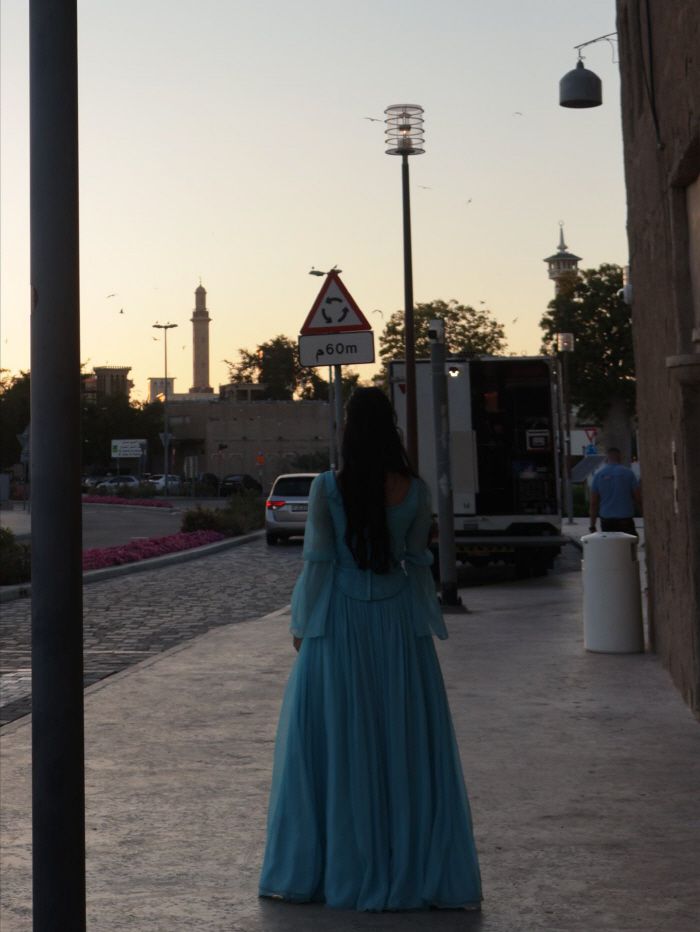공개된 비하인드 사진 속 송혜교는 두바이 사막을 배경으로 푸른 드레스를 입고 신비로운 분위기를 자아냈다. 노을빛 하늘 아래,그의 실루엣은 마치 한 폭의 그림처럼 신비롭다. 그는 촬영 전 거울과 휴대전화를 통해 끊임없이 자신의 모습을 확인하며 프로다운 집중력을 보였고, 황혼빛 하늘 아래에서 여신 같은 뒷모습을 선보였다.