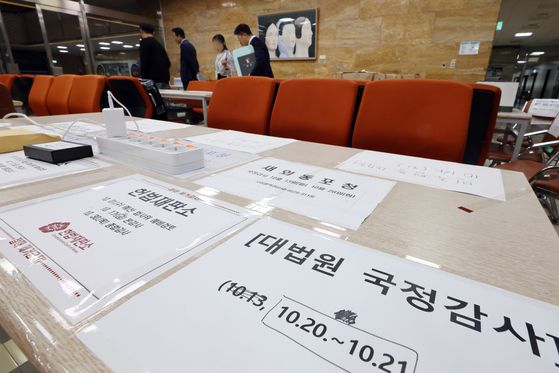 이재명 정부 첫 국정감사를 사흘 앞둔 10일 서울 여의도 국회 법제사법위원회 앞 대기 장소에 대법원 등 피감기관 직원들이 붙여 둔 종이에 기관명이 적혀 있다. 연합뉴스